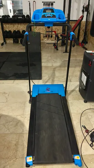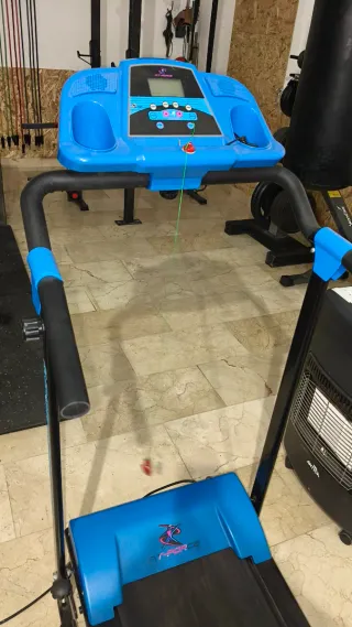 Cinta de correr de color azul, ideal para entrenar en casa. Su diseño compacto la hace fácil de integrar en cualquier espacio. - Consola con pantalla. - Empuñaduras de tacto suave. - Base de la cinta en color negro. -Velocidad 10 k/h