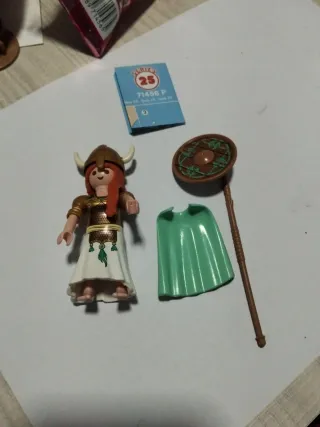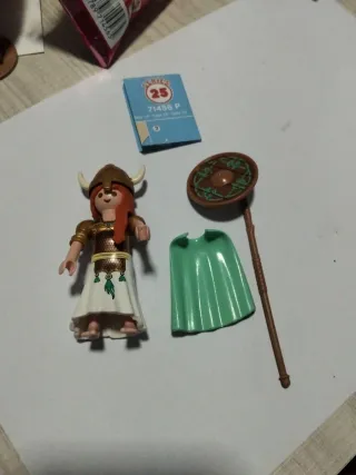 Figura de Playmobil de una vikinga de la serie 25. - Incluye casco con cuernos. - Armadura dorada. - Falda blanca con detalles. - Capa verde. - Escudo y lanza.