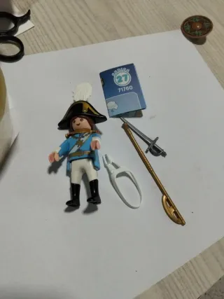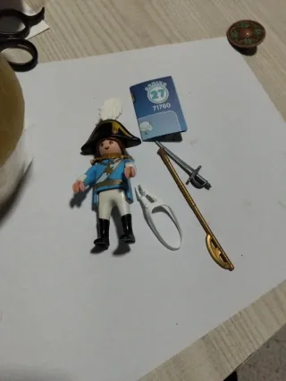 Figura de Playmobil de un soldado con uniforme azul y sombrero. - Incluye espada y lanza dorada. - Viene con pinzas blancas. - Incluye folleto de la serie 27, número 71760. - Se incluye un pequeño escudo decorativo.