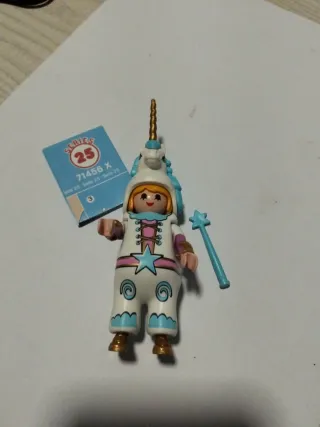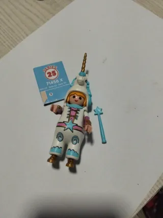 Figura de Playmobil de la Serie 25, con un divertido disfraz de unicornio. - Incluye figura de Playmobil. - Disfraz de unicornio blanco con detalles azules y estrella. - Accesorios: varita mágica. - Tarjeta coleccionable de la Serie 25.