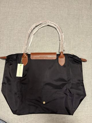 Bolso grande en color negro con detalles en marrón. - Asa de hombro. - Cierre de botón a presión. - Etiqueta.