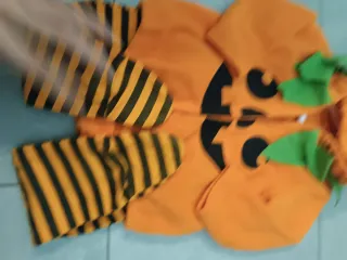 Disfraz de calabaza para niños, ideal para Halloween o fiestas temáticas. El diseño es divertido y llamativo. - Color naranja principal. - Detalles de rayas negras y amarillas en mangas y piernas. - Cara de calabaza con ojos y boca. - Hojas verdes en la parte superior.