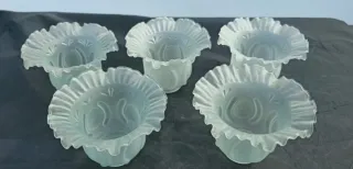 5 tulipas/pantallas fabricadas en vidrio esmerilado (frosted/satinado) de color blanco opalino, con borde ondulado (ruffled/scalloped) que les da un toque Art Déco. Cada pieza presenta un bonito relieve moldeado con motivos ovales centrales y elementos florales o de hojas en la parte superior e inferior. El diseño es el mismo en todas, con ligeras variaciones naturales del molde. Medidas: Altura: 12 cm Diámetro superior: 13,2 cm Diámetro de la boca inferior: 3,81 cm Peso total: 800 gr Estado: Muy bueno, sin roturas ni grietas. Desgaste normal y lógico de piezas antiguas. El vidrio conserva su brillo mate característico.