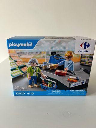 Set de Playmobil de la caja registradora de Carrefour. - Incluye 22 piezas. - Recomendado para edades de 4 a 10 años. - Figuras de clientes y cajero. - Accesorios de supermercado.