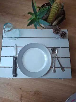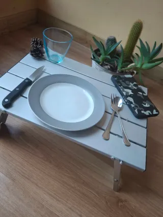 Mesa ligera y práctica, ideal para llevar de camping o para usar en exteriores. Su diseño plegable facilita su transporte y almacenamiento. - Material: Aluminio - Plegable, resistente y muy ligera