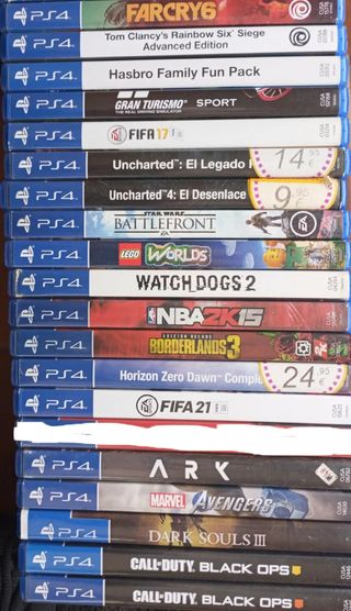 Lote de 19 videojuegos para PlayStation 4. - Tom Clancy's Rainbow Six Siege Advanced Edition - Hasbro Family Fun Pack - Gran Turismo Sport - FIFA 17 - Uncharted: El Legado Perdido - Uncharted 4: El Desenlace del Ladrón - Star Wars Battlefront - Lego Worlds - Watch Dogs 2 - NBA 2K15 - Borderlands 3 - Horizon Zero Dawn Complete Edition - FIFA 21 - Ark - Marvel's Avengers - Dark Souls III - Call of Duty: Black Ops - Call of Duty: Black Ops - Caja de Far Cry 6 (con Tom Clancy's Ghost Recon Wildlands) No negocio el precio, sale a menos de 5€ por juego... Si quereis juegos individuales vendo a 10€ el juego (minimo 2).