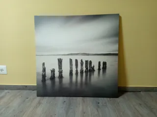 Póster de tela con un paisaje marino y postes de madera. - Diseño en blanco y negro. - Ideal para decorar cualquier estancia. Tamaño 1m x 1m aprox