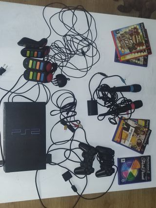 Consola de videojuegos clásica en color negro. Muchos años pero poco uso. En muy buen estado - Incluye dos mandos estándar - Cuatro mandos tipo Buzz. - Dos micrófonos. - Juegos: 3 Buzz!, 2 Singstar, Trivial Pursuit. - Cables de conexión. Vendo todo junto o se puede negociar accesorios por separado