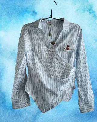 Camisa de Vivienne Westwood con un diseño cruzado y estampado de rayas finas. El tejido tiene brillos. Talla poco N00p0 R3333alL - Diseño cruzado asimétrico. - Estampado de rayas verticales finas. - Detalle de logo bordado en el pecho.