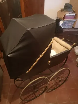 Este es un carro de bebé de estilo clásico, con un capazo cubierto y ruedas de radios. - Capazo negro con funda. - Estructura metálica y de madera - Ruedas de radios. Ideal para decoración para hoteles, Casas rurales etc.. (recoger en mano)