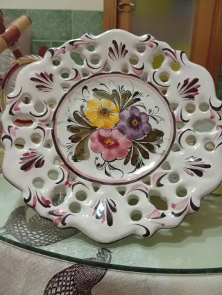 Precioso plato decorativo de cerámica, con un diseño floral pintado a mano. - Borde calado con detalles. - Motivos florales coloridos en el centro. - Ideal para decoración.
