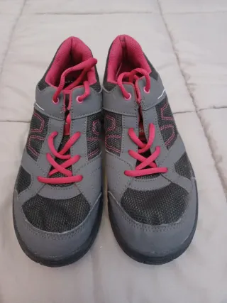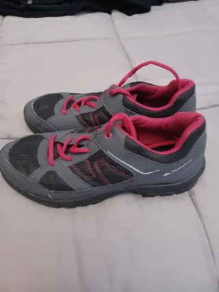 Zapatillas de montaña y senderismo Quechua en color gris con detalles en rosa. - Cierre con cordones. - Suela de goma. - Diseño deportivo.