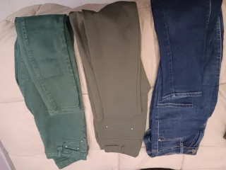 Conjunto de tres pantalones, dos de estilo vaquero y uno elástico. - Pantalón vaquero azul. - Pantalón elástico verde. - Pantalón elástico verde oliva.