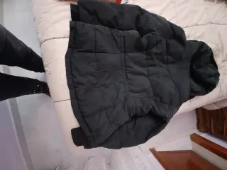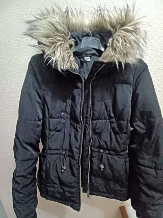 Cazadora negra con detalles de pelo en la capucha. - Cierre de cremallera. - Cordones ajustables en la cintura. - Bolsillos frontales.