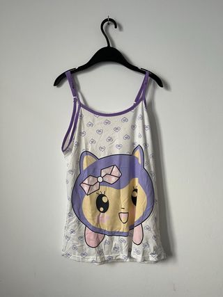Pijama cómodo con un adorable estampado de gatito y corazones. - Tirantes finos ajustables. - Diseño de gatito con lazo. - Estampado de corazones pequeños.
