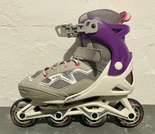 Patines en línea Oxelo hasta 39 con un diseño moderno en gris y morado. Perfectos para iniciarse en el patinaje. - Talla ajustable para adaptarse al crecimiento. - Ruedas de 80 mm. - Cierre de seguridad con velcro y hebilla. Algún roce, ver fotos.