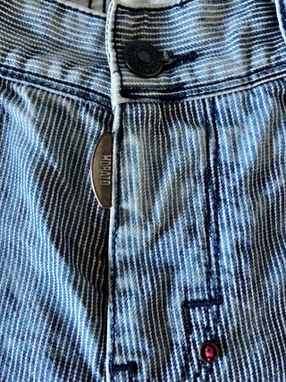 Pantalón de vestir con un diseño de rayas verticales. - Cierre de botón y cremallera. - Bolsillos funcionales. - Detalle de etiqueta de la marca.