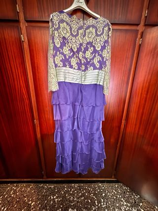 Elegante vestido de madrina con un diseño sofisticado. - Cuerpo de encaje floral. - Cinturón con lazo decorativo. - Falda con volantes en cascada.