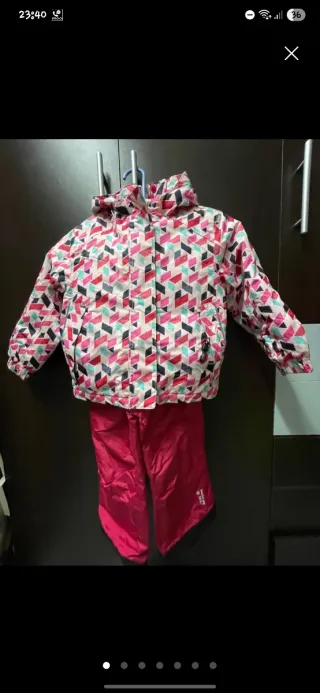 Conjunto de ropa de nieve para niña, ideal para mantenerse abrigada y seca. Talla 98-104 (2-4 años). - Chaqueta con estampado geométrico en blanco, rosa y azul. - Pantalones de color rosa intenso.