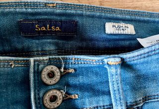 Pantalón vaquero de tiro alto con efecto push-in. - Cintura de doble botón. - Bolsillos delanteros. - Detalle de costura lateral.