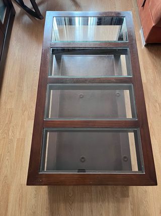 Elegante mesa de centro con estructura de madera de roble y tapas de cristal. - Diseño moderno y funcional. - Combina la calidez de la madera con la transparencia del cristal.