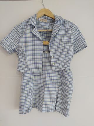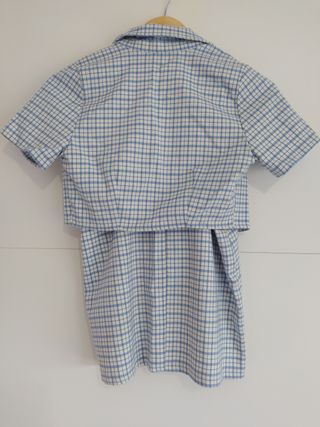 Conjunto de dos piezas (Co-ord) de la marca Pacific Republic (Pull&Bear). Incluye: Chaqueta corta (crop blazer) y falda mini a juego. Estampado de cuadros vichy en azul y blanco. Talla S (36). Ideal para talla juvenil o petite. Tejido fresco y ligero. Estado impecable. Se entrega lavado y planchado. Estilo Clueless / 90s / Preppy. REF 82