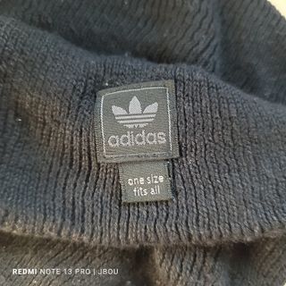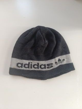 Gorro de punto (beanie) de la marca Adidas. Color negro con franja gris y el logo clásico del trébol (Adidas Originals) tejido. Talla: Única (One size fits all), se adapta bien. Unisex. Estado: Usado. El tejido tiene "bolitas" (pilling) visibles del uso y los lavados (ver fotos de detalle), pero no tiene rotos. Perfecto para uso diario, ir a entrenar o estilo urbano. REF 97
