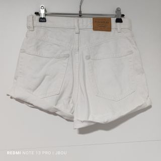 Shorts vaqueros (denim) de color blanco de la marca Pull&Bear. Talla 36 (S). Estilo tiro alto (High Waist) con el bajo vuelto. Etiqueta trasera "Comfortable Denim". Tejido vaquero 100% algodón, resistente y cómodo. Estado: Muy buen estado. REF 100