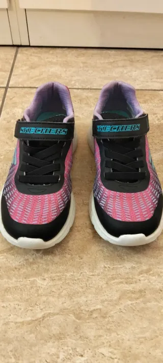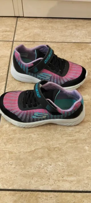 Zapatillas deportivas para niña de la marca Skechers en talla 29. Presentan un diseño vibrante con tonos rosas y morados. - Cierre de velcro y cordones. - Parte superior de malla transpirable. - Suela blanca y flexible. Se envían en su caja original