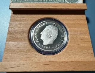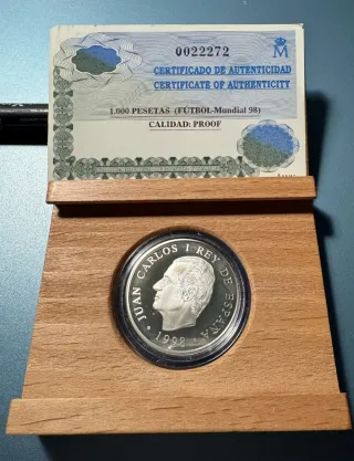 Moneda de plata conmemorativa del Mundial de Fútbol de 1998. - Valor nominal de 1.000 pesetas. - Calidad Proof. - Presentada en su estuche de madera. - Incluye certificado de autenticidad.