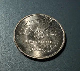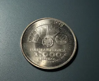 Moneda conmemorativa de plata de la República Portuguesa. 27 gramos de plata 0,500 13,5 gramos plata pura - Año: 1998 - Valor: 1000 Escudos - Diseño: Brújula y escudo de Portugal - Conmemoración: EXPO'98