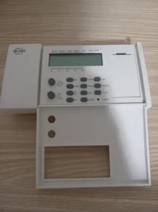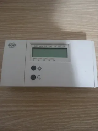 Termostato para calefacción de la marca ELRO. Permite programar la temperatura. - Pantalla digital. - Botones de control. - Indicadores de día y noche.