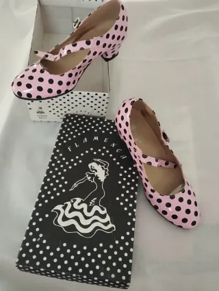 Zapatos de flamenca con un divertido estampado de lunares. - Color rosa con lunares negros. - Talla 31. - Cierre de tira con hebilla.