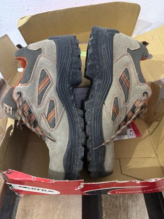 Calzado de seguridad COFRA, diseñado para el trabajo. No se han llegado a gastar NUNCA. - Color beige y naranja. - Cierre con cordones. - Logo de la marca en la lengüeta y en el lateral.