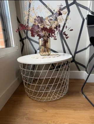 Mesa auxiliar de diseño moderno con sobre blanco y estructura metálica. - Sobre de madera con acabado blanco. - Base de metal con diseño de rejilla. - Ideal como mesita de noche o auxiliar.