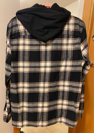 Camisa de cuadros con capucha. - Diseño a cuadros en tonos beige y negro. - Capucha integrada. - Cierre de botones.