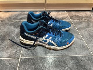 Zapatillas deportivas Asics modelo Gel-Rocket. - Color azul con detalles blancos y naranjas. - Diseño deportivo y ligero. Perfectas para balonmano o futbol sala. Muy poco uso, un poco sucias de pega, pero con un lavado quedan perfectas.