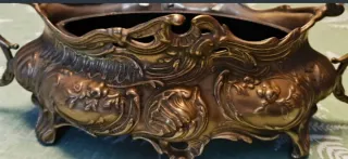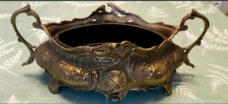Precioso centro decorativo antiguo con un diseño ornamentado y asas. - Material: Metal - Color: Bronce - Estilo: Clásico - Asas laterales decorativas