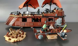 Set de Lego Star Wars 6210. Barcaza de Jabba el Hutt del Episodio VI El Retorno del Jedi. IMPORTANTE: Falta la figura de Jabba el Hutt y la de Boba Fett no es la original. También falta la pieza del cuello de Leia para conectar la cadena (la cadena sí está), la pieza con la que R2D2 sostiene las copas y la mini figura de la araña. Las demás figuras son las originales. No he visto que falte nada más tras comprobarlo. La caja original no la tengo, las instrucciones sí.