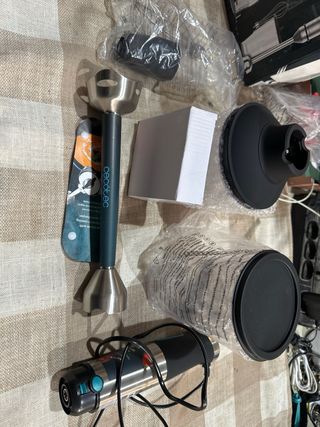 Batidora de mano Cecotec Power TitanBlack 1500 XL con tecnología CrossBlades. - Cuchillas de 4 hojas. - Pie XL. - Antisalpicaduras. - Selector de velocidad con función Turbo. - Vaso de 800 ml con tapa.