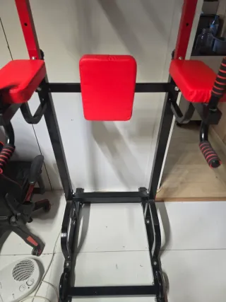 Estación grande multifuncional para entrenar en casa. Solo tiene desgastados algunos agarres. - Barras para dominadas. - Soportes para fondos. - Agarres para flexiones. - Cojines de apoyo. - Estructura metálica resistente.