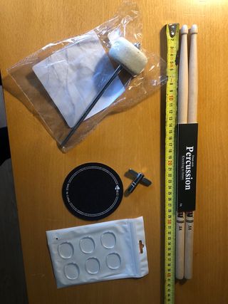 Kit de accesorios para batería. - Baquetas de madera. 5A - Maza fieltro para pedal de bombo. - Protector de golpeo para parche bombo. - Llave de afinación. - Gel amortiguador Moongel. (Paquete de 6 unidades)