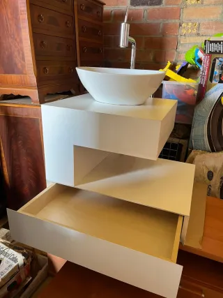 Conjunto de mueble de baño con lavabo y grifo. - Diseño moderno y funcional. - Amplio espacio de almacenamiento con cajón. - Acabado en blanco.