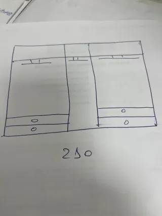 Armario de madera con varios compartimentos y cajones. - Diseño de tres columnas. - Compartimentos superiores para colgar ropa. - Cajones inferiores para almacenamiento adicional.