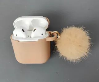 Auriculares inalámbricos AirPods de segunda generación. - Color blanco. - Incluye funda protectora color beige. - Adorno de pompón de pelo color camel. Funciona bien, algunos señales de uso. Solo la funda vale 15€