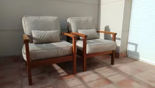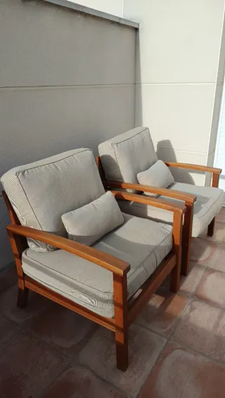 Conjunto de dos butacas de teca, perfectas para tu espacio exterior. Su diseño combina la calidez de la madera con la comodidad de los cojines. - Estructura de madera de teca. - Cojines en tono beige.