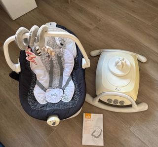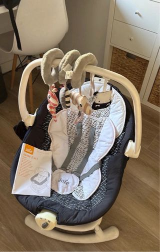 Joie Sansa 2 en 1: tumbona portátil con movimientos multidireccionales, musica relajante y función balancin extraible. Ideal desde el nacimiento hasta 9 kg. Columpio con múltiples posibilidades de movimiento, se desliza hacia delante y hacia atrás, de lado a lado o combina las dos opciones El asiento extraible puede usarse como un balancín portátil fuera de la base. La base esta un poco amarillenta por el sol però la funda està en muy buen estado.