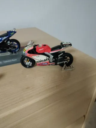 Conjunto de cuatro modelos de motocicletas a escala. - Moto Yamaha YZR-M1 Max Biaggi 2002. - Moto Yamaha YZR-M1 (2015) Valentino Rossi. - Moto Ducati. - Moto de carreras naranja y azul.
