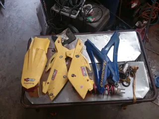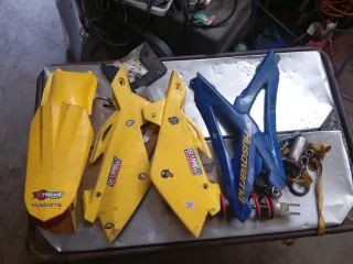 Kit de plásticos para Husqvarna 125 2T del año 2007. Incluye varias piezas amarillas y azules. - Plásticos amarillos con logos de TREMP MOTOR Husqvarna - Plásticos azules con logos de Husqvarna. Buen estado un poco sucios.