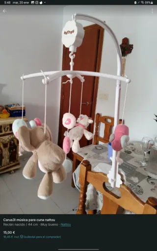 Móvil musical de la marca Nattou, ideal para la cuna de tu bebé. Incluye peluches. - Diseño con peluches de animales. - Melodía relajante. - Altura: 44 cm.